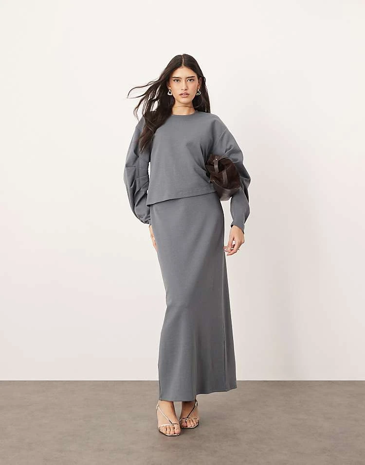 ARRANGE Premium Boxy Top With Pleat Sleeve Detail With Heavy Weight Textured Jersey Column Maxi Skirt Co-ord In Charcoal